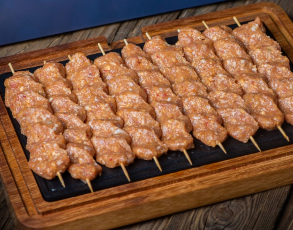 كباب دجاج مبرد مفروم مع التوابل مسيخ، الكيلو 15 سيخ، تكفي 2 إلى 3 أشخاص.